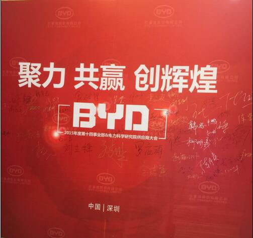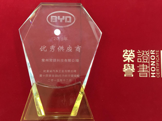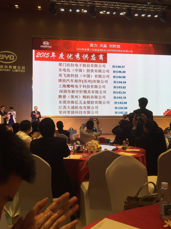 參加比亞迪汽車(BYD)第十四事業(yè)部&電力科學研究院“2015年供應商大會”照片,并獲得“優(yōu)秀供應商”榮譽稱號。
